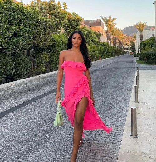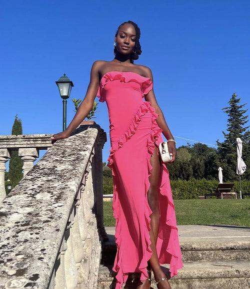 'Sarina' is our gorgeous strapless creation thats's beautifully designed with fluttery ruffles for the prettiest of details. Cut from lightweight georgette, 'Sarina' is ultra sexy yet elegant in a fuchsia hue.
