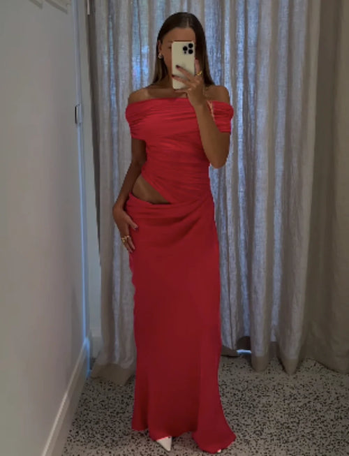 Meet Nico, an elegant update to our Yasmin Maxi Dress, featuring an off-shoulder design and flattering cowl on the left side waist. The overlapping skirt and mesh bodice create a unique and stylish look, with the option to show more skin on the wearer's left hand side waist. Perfect for those looking for a sophisticated and modern dress for any occasion.