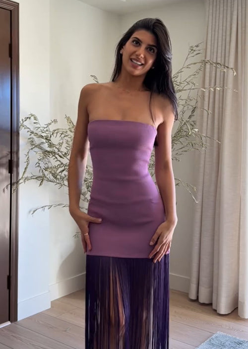 HOW THE MESHKI Koah Fringe Bandage Knit Maxi Dress - Purple IS BEING WORN
