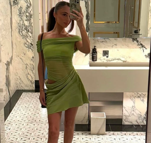 Meet the Nico Mini Dress, featuring an off-shoulder design crafted from a lightweight stretch mesh and flattering cupro skirt with a cowl on the left side waist. The overlapping skirt and mesh bodice creates depth, with the option to show more skin on the wearer's left hand side waist.