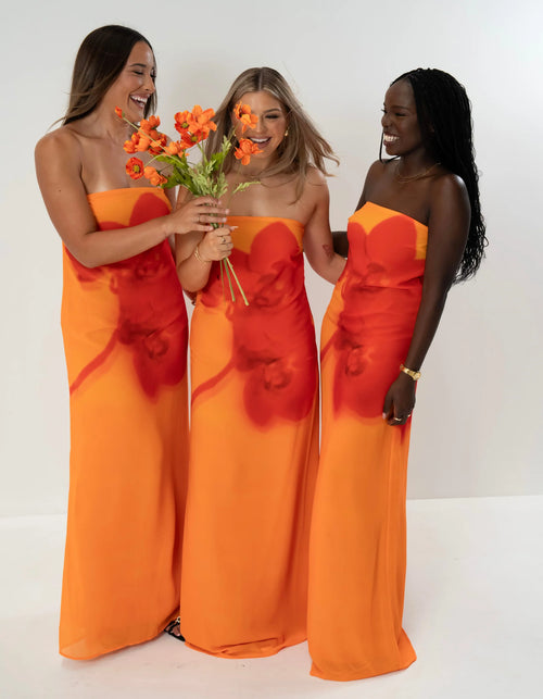 HOW THE MESHKI Amaya Strapless Chiffon Maxi Dress Koi Orchid Print IS BEING WORN