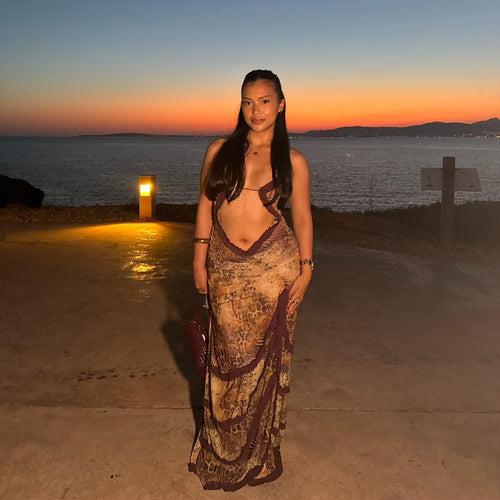 Crafted for standout sophistication, this leopard script print maxi dress features adjustable straps for a versatile wear, and a daring thigh-high split. This maxi-length dress is complete with an intricate ruched front and side seam detailing and a burgundy mesh ruffle trim finish.